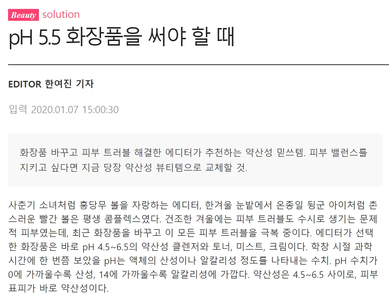 2010년에 지적한 pH제품이 2020년에 이르러서야 중요한 포인트가 되는 현재의 모습입니다. 유스트의 클렌징젤은 2007년 부터 pH를 표기하는 약산성 클렌징젤 이였습니다.