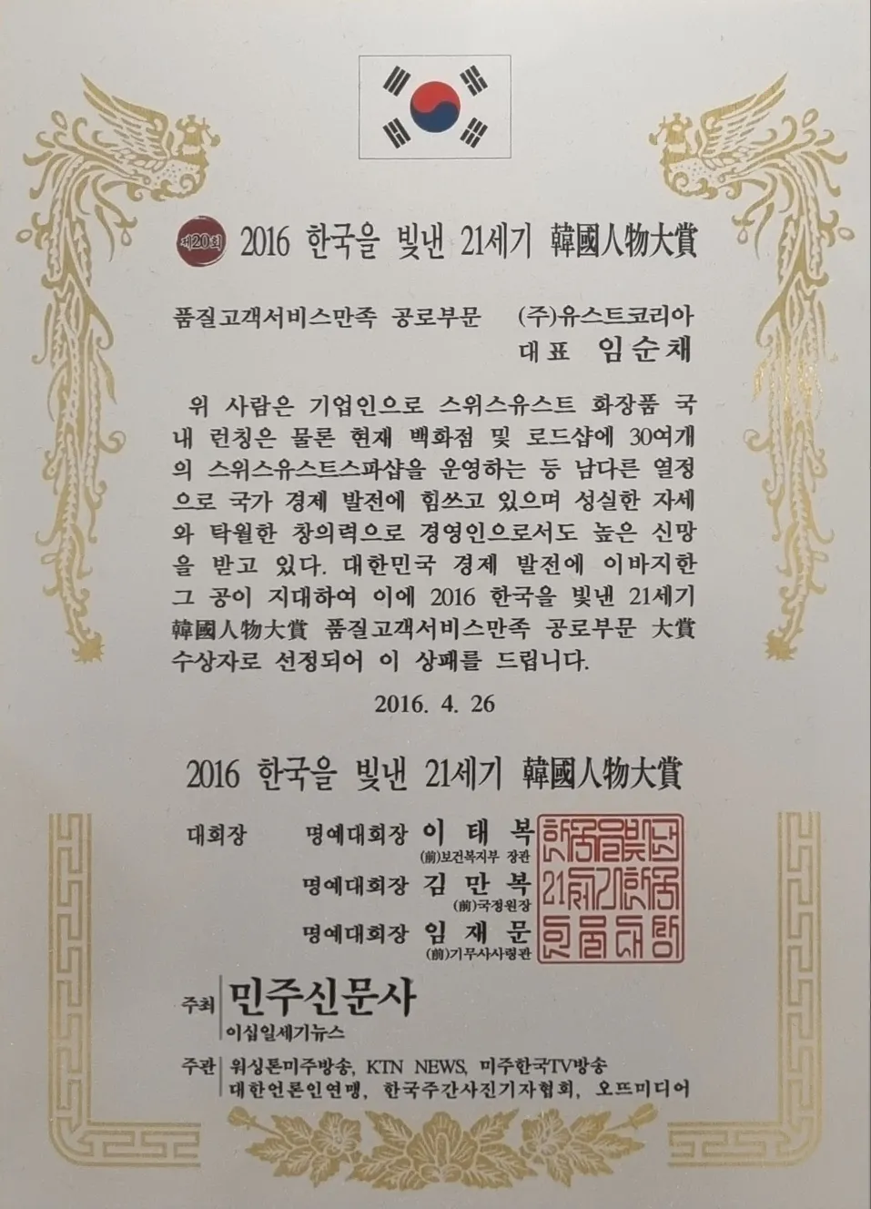 (주)유스트코리아 임순채 대표님께서 대한민국 인물 대상에서 수상하신 영예를 공유하게 되어 정말 자랑스럽습니다. 이 사진은 그 소중한 순간을 담은 것으로, 대표님의 끊임없는 노력과 헌신이 고객님들께 더 나은 서비스를 제공하기 위한 원동력이 되었음을 보여줍니다. 함께 이 기쁨을 나누며, 앞으로도 대표님과 회사의 더 큰 발전을 응원해주시길 바랍니다.