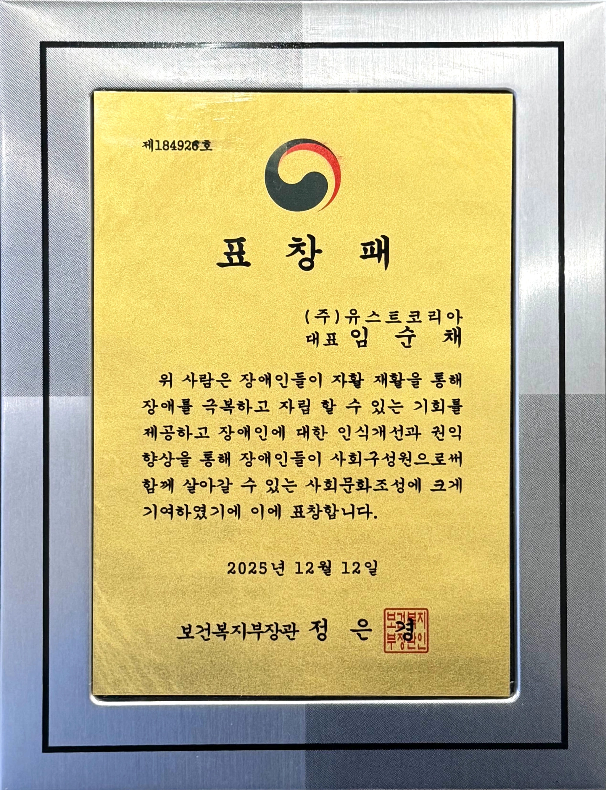 장애인에 대한 인식 개선과 권익 향상을 통해 건강한 사회문화 조성에 기여한 공로를 인정받아,