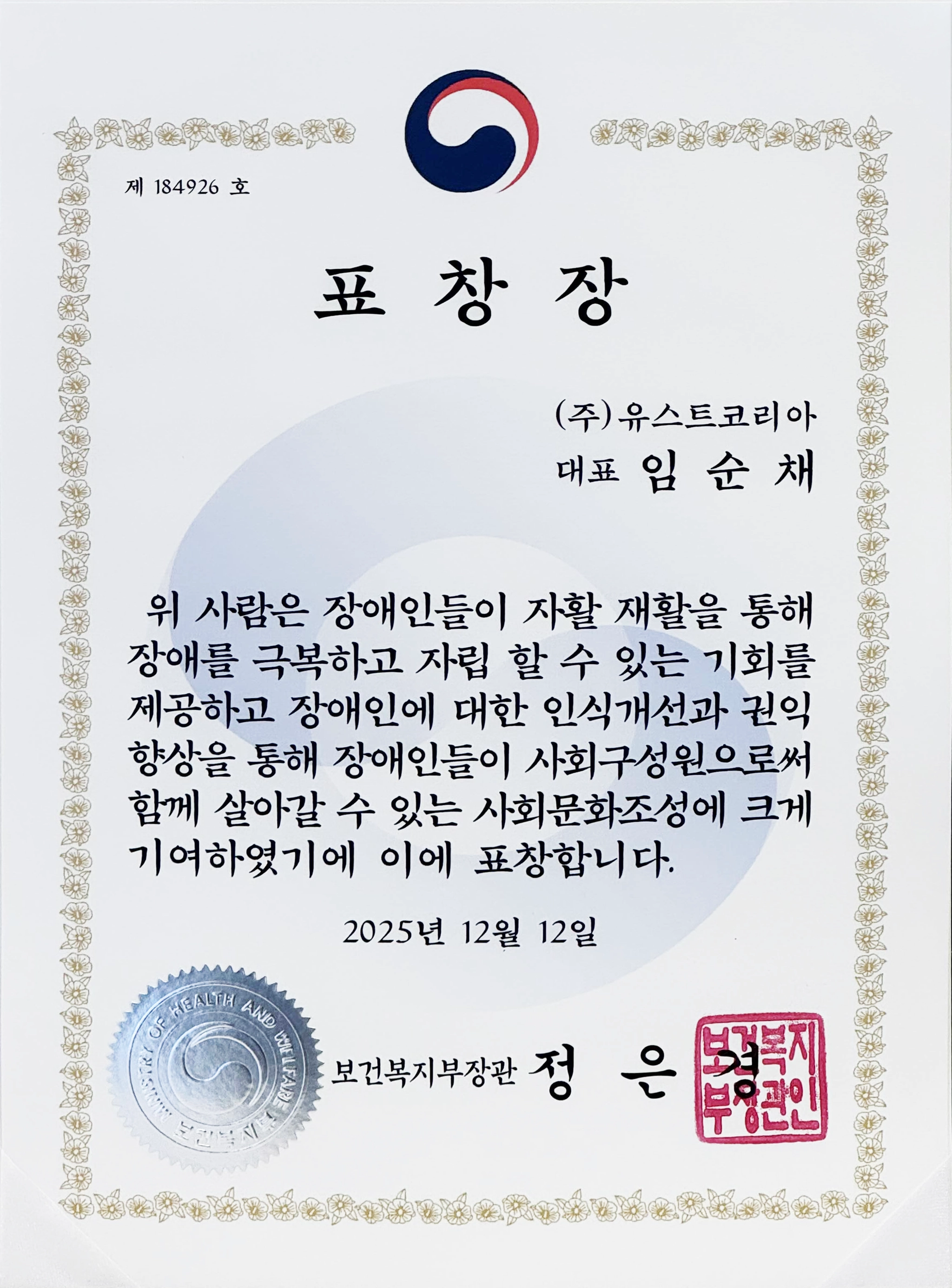 2025년 12월 12일 | 보건복지부장관 표창 수상
